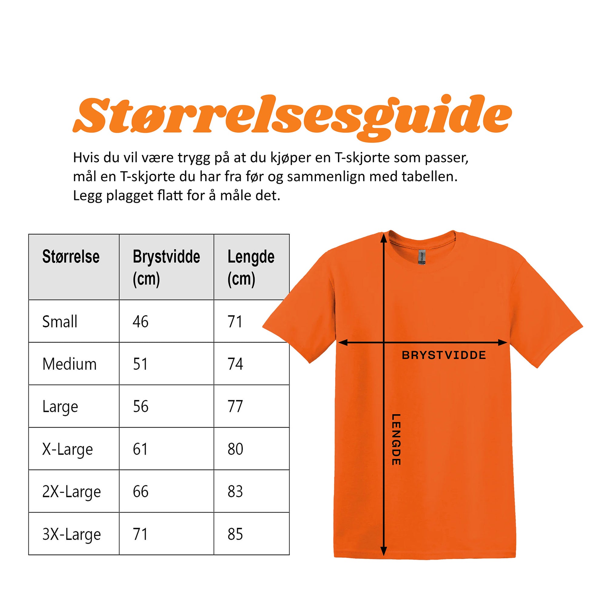 Hvis du vil være trygg på at du kjøper en T-skjorte som passer, mål en T-skjorte du har fra før og sammenlign med tabellen. Legg plagget flatt for å måle det.