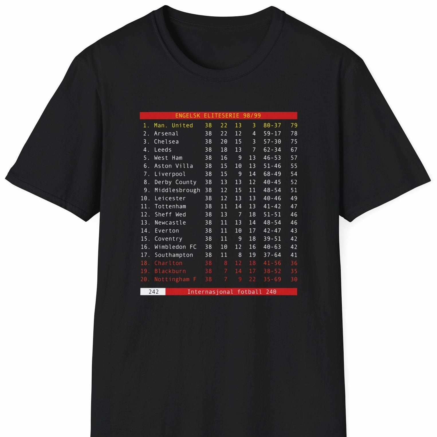 T-skjorta for deg som husker legendesesongen 98/99 🏆🏆🏆 Manchester United vant The Treble - Champions League, FA-cupen og Premier League. Her er ligatabellen, sånn den så ut på tekst-TV side 242 📺